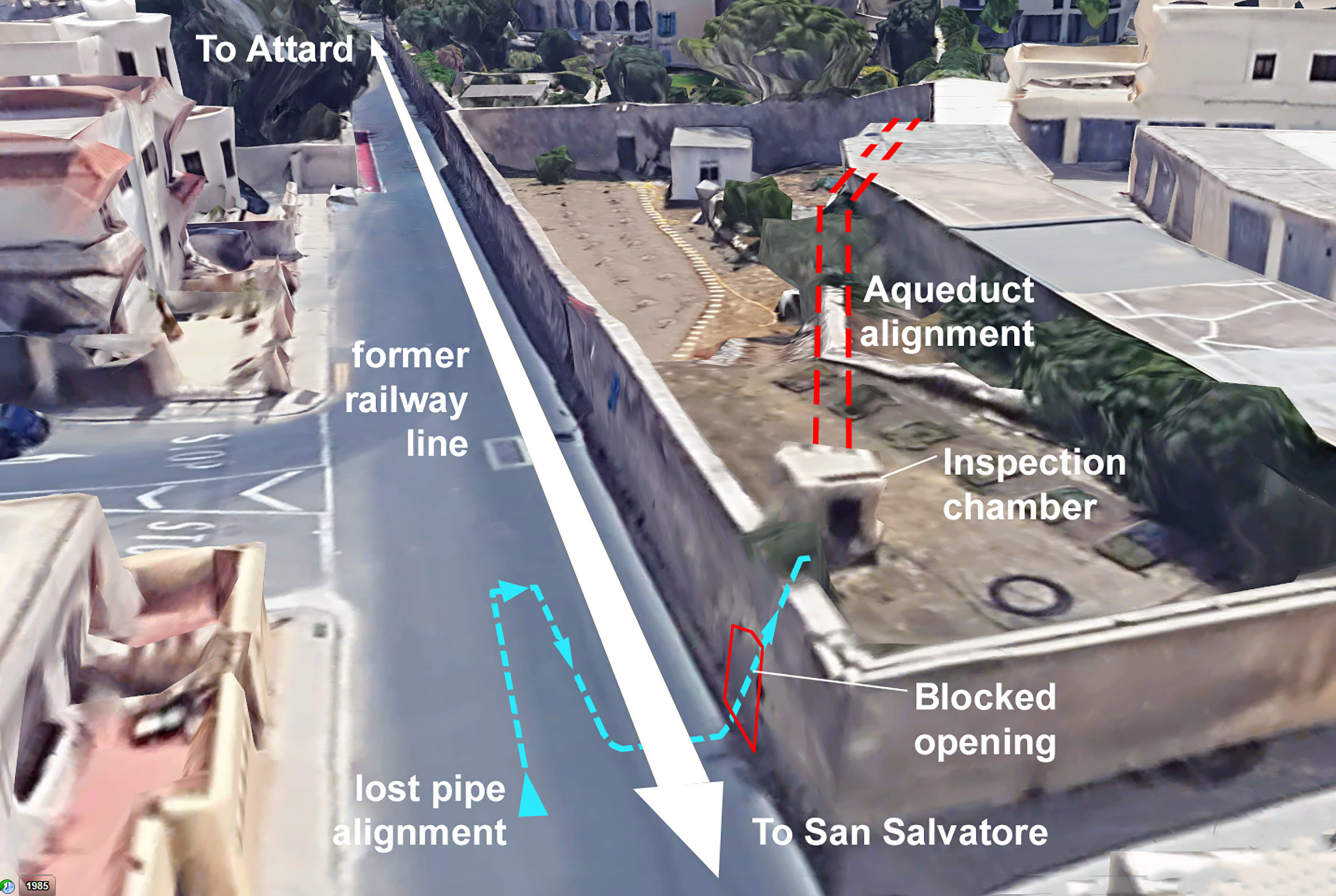Diagram showing the aerial view from the north-east. The aqueduct flowed from right-to-left. Triq Il-Linja is the course of the old railway. The diversion of the aqueduct and syphon is in blue.