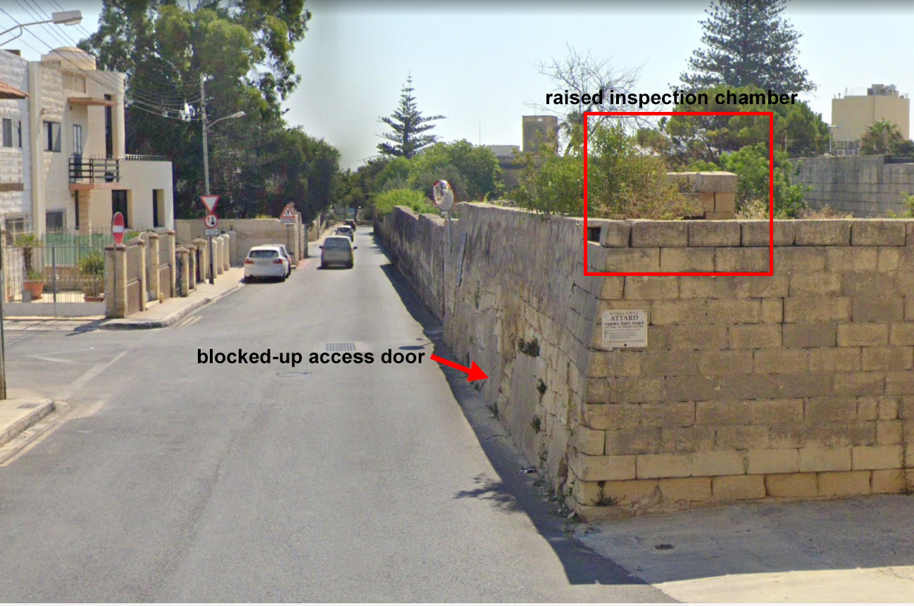Today, Triq Il-Linja replaces the railway line and the north side of the old cutting has been removed and opened-out, but the south face survives where the syphonic pipe once crossed. A blocked inspection opening can still be seen in the side of the rockface and in the field above it a short stone tower can just be seen. This is another forgotten piece of railway infrastructure: the protective chamber that contained a silt trap and inspection chamber. It’s not rectangular in plan, but an irregular pentagon, the same as it was drawn in 1883. It has a door in the western side and the odd angled western side is aligned with the continuation of the original aqueduct on its onward journey towards Valletta.
