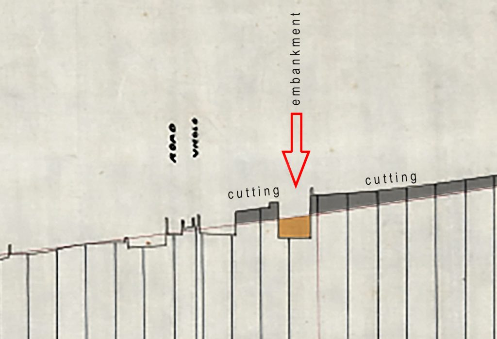 It’s difficult to work out whether it incorporated a bridge, but it must have added a little drama to the journey. Passengers at first first dropped beneath the level of the surrounding fields before launching over the high causeway and then back into the confines of another cutting.