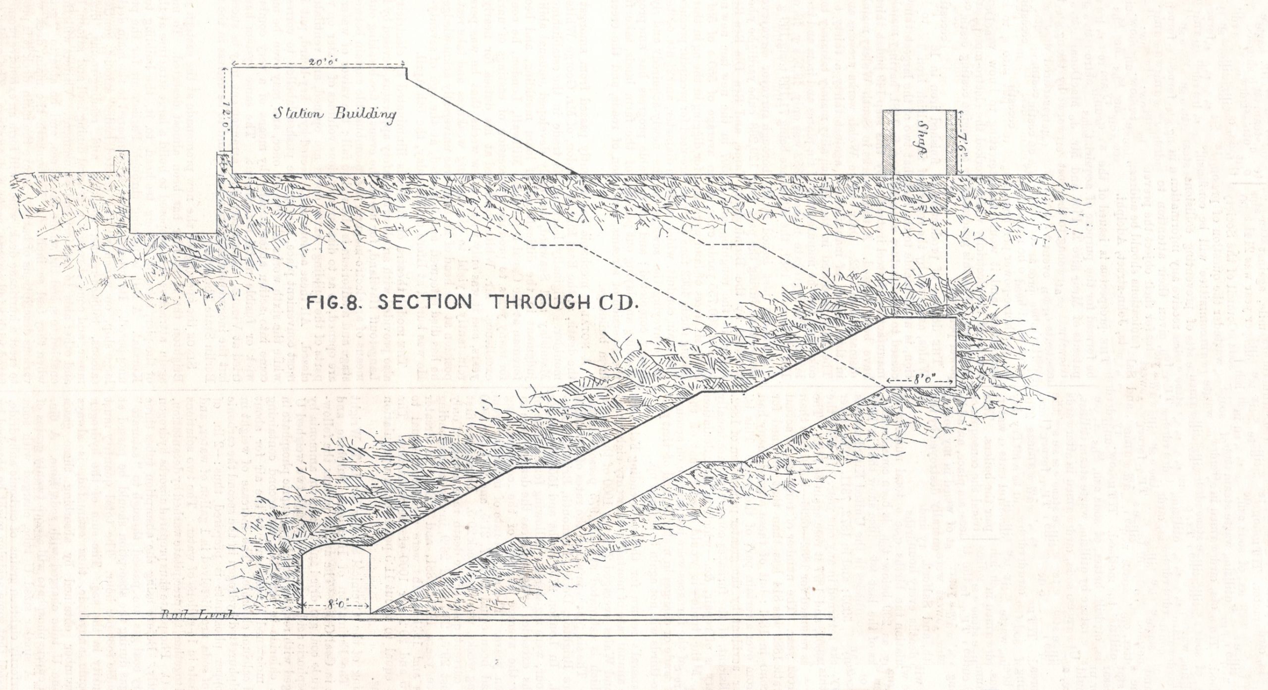 However, substantial works were indeed implemented with a significant investment made in digging the cutting and creating access, but it’s unclear when the project started or what became of it. Visiting the site today you can see the cutting made along the outer edge of St Philip’s curtain wall and the dog-leg ramp that leads down to platform level with steel supports and an ornamental balustrade. This is still accessed off the historic ramp through the fortifications, its entrance close to the old station building.