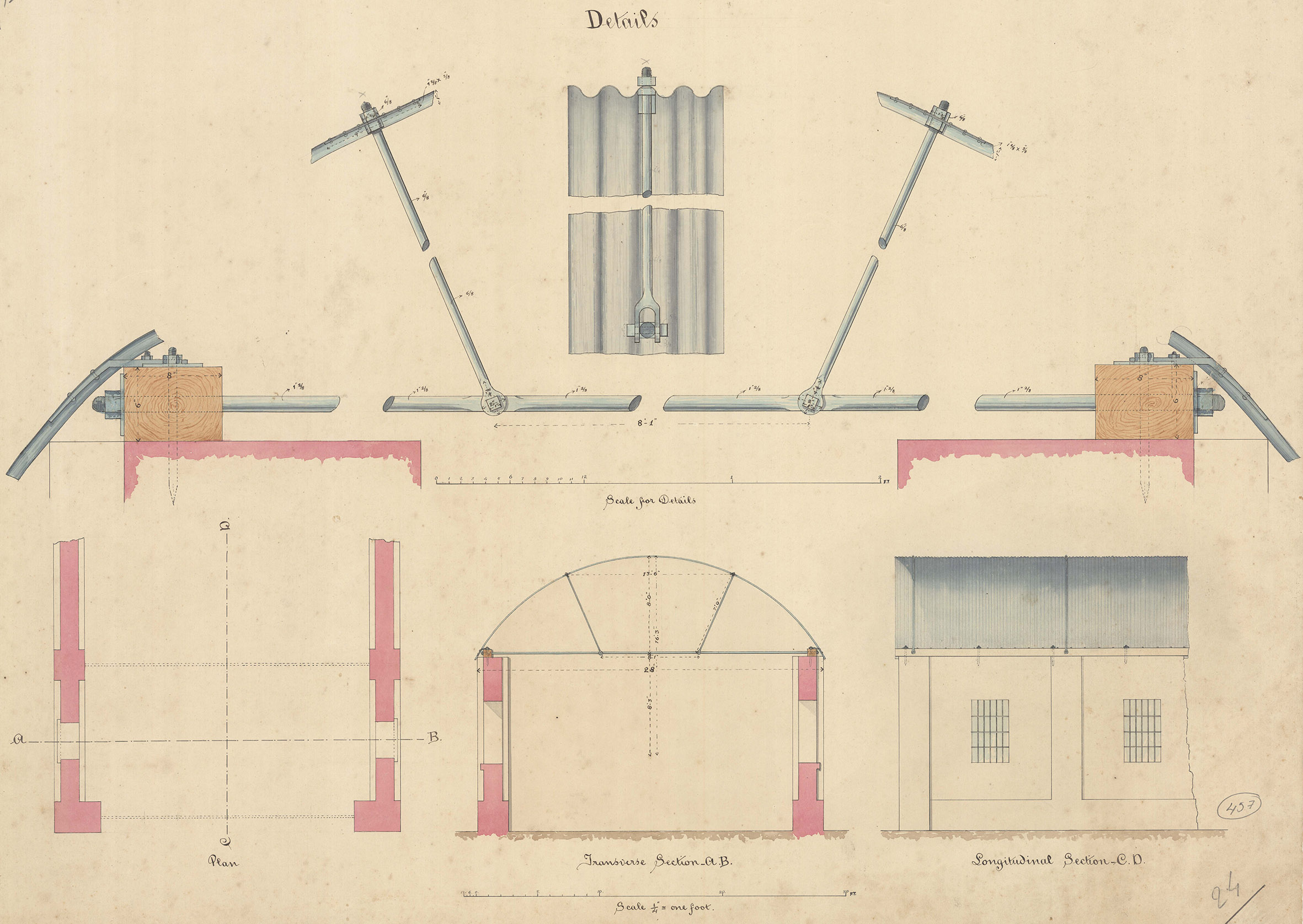 The designs of the largest of these buildings, the carriage shed, survive. Even at opening, it was too small to shelter all the new rollingstock. It was on the north east side of the station, parallel with the main line, and with two roads. It was simple in design, having stone walls to three sides, the fourth side open for carriage access. Windows lit the interior from both long sides and the roof was a lightweight steel frame structure covered in a curving galvanised corrugated iron roof.