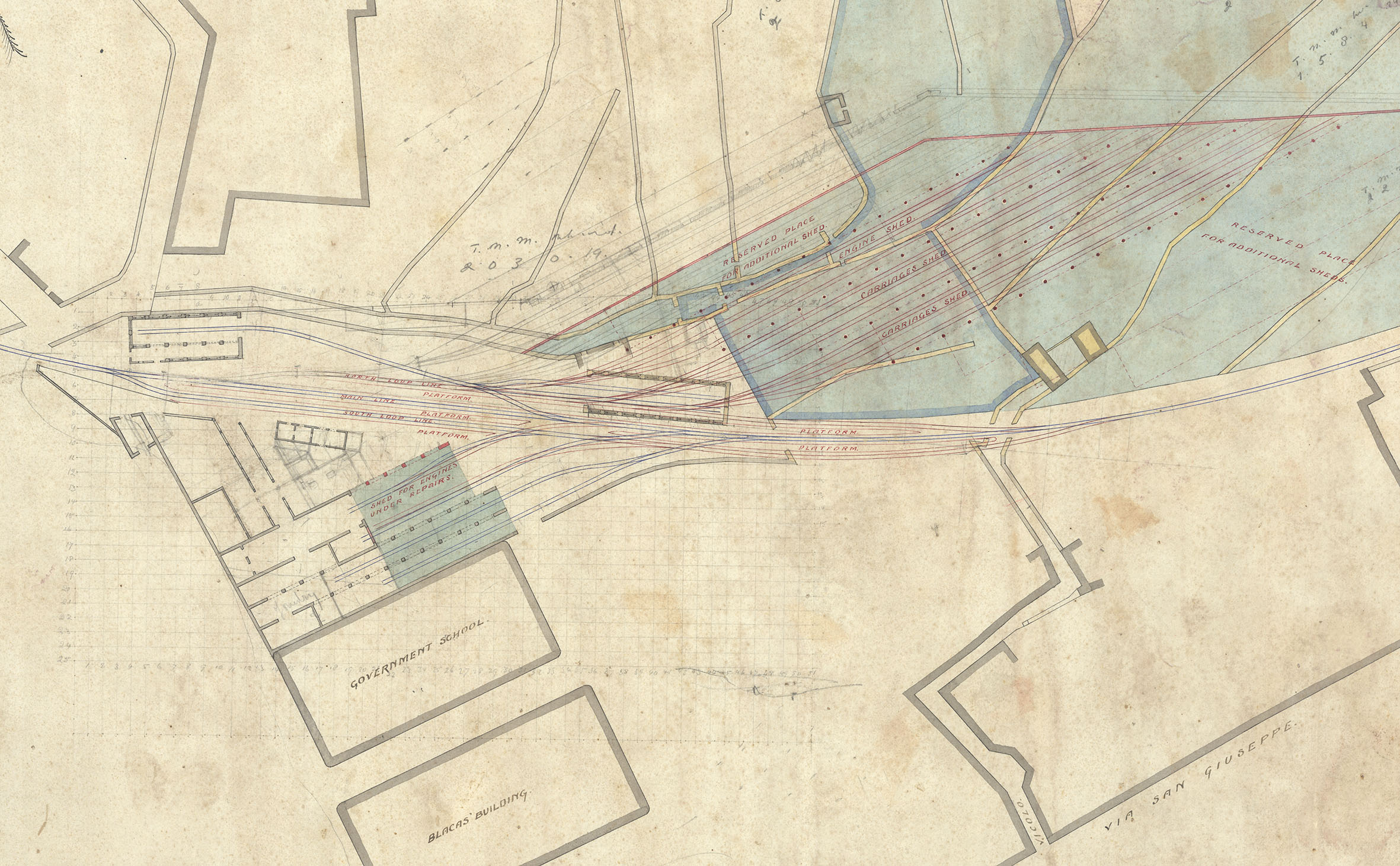 The site chosen for the new station was on a strip of land taken from the Ta Blacas (or Placas) estate, at the start of a wide bend where the track came closest to the town. As it happened, the mansion, gardens and land of Ta Blacas had just been acquired by the Government who cooperated with the railway for mutual benefit. Part of the once-beautiful gardens was transferred to the railway whilst much more was laid out for development. Perhaps seeing the potential of the coming railway they had model workers housing, Blacas Buildings, built on a new public square, Pjazza San Pawl. This would be of direct benefit to the railway in providing homes for its workers. A new Government School built between it and the station site would also become significant to the railway.