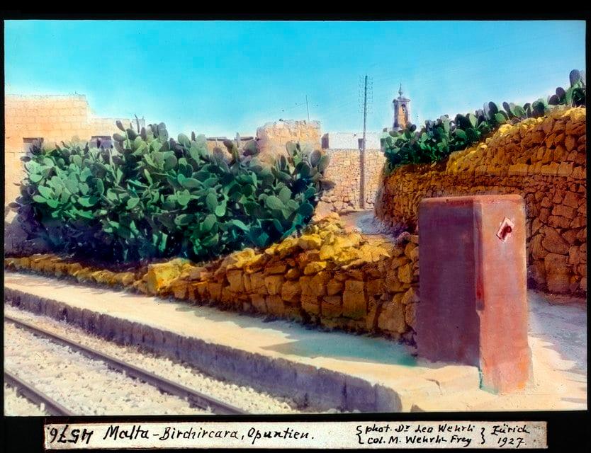 A tinted magic lantern slide of 1927 showing the level crossing at Guard hut No.6, with the low platform that constituted Santa Venera station evident. The stone pier has a fixing onto which the chain was hung to close the level crossing.