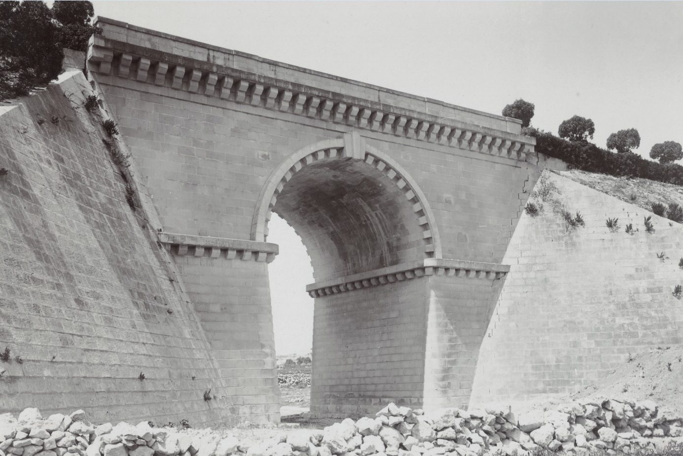 By far the most impressive bridge on the Malta Railway, its most monumental structure, was the Gheriexem bridge. When plans were approved for the extension of the railway to Mtarfa in 1895 it required the crossing of the valley on the other side of Mdina at a high level. Initial designs proposed a fifteen-arched stone viaduct; this was probably rejected as being impractical. Instead, a monolithic embankment was projected that at its midpoint would incorporate a single-arched bridge across the stream in the valley bottom. The scale of the endeavour required more substantial works than those encountered with other embankments on the line, and a far greater land-take. Conventional earth banks were thrown up, partially from material dug from the new tunnel but the quantities needed must have required much more.
