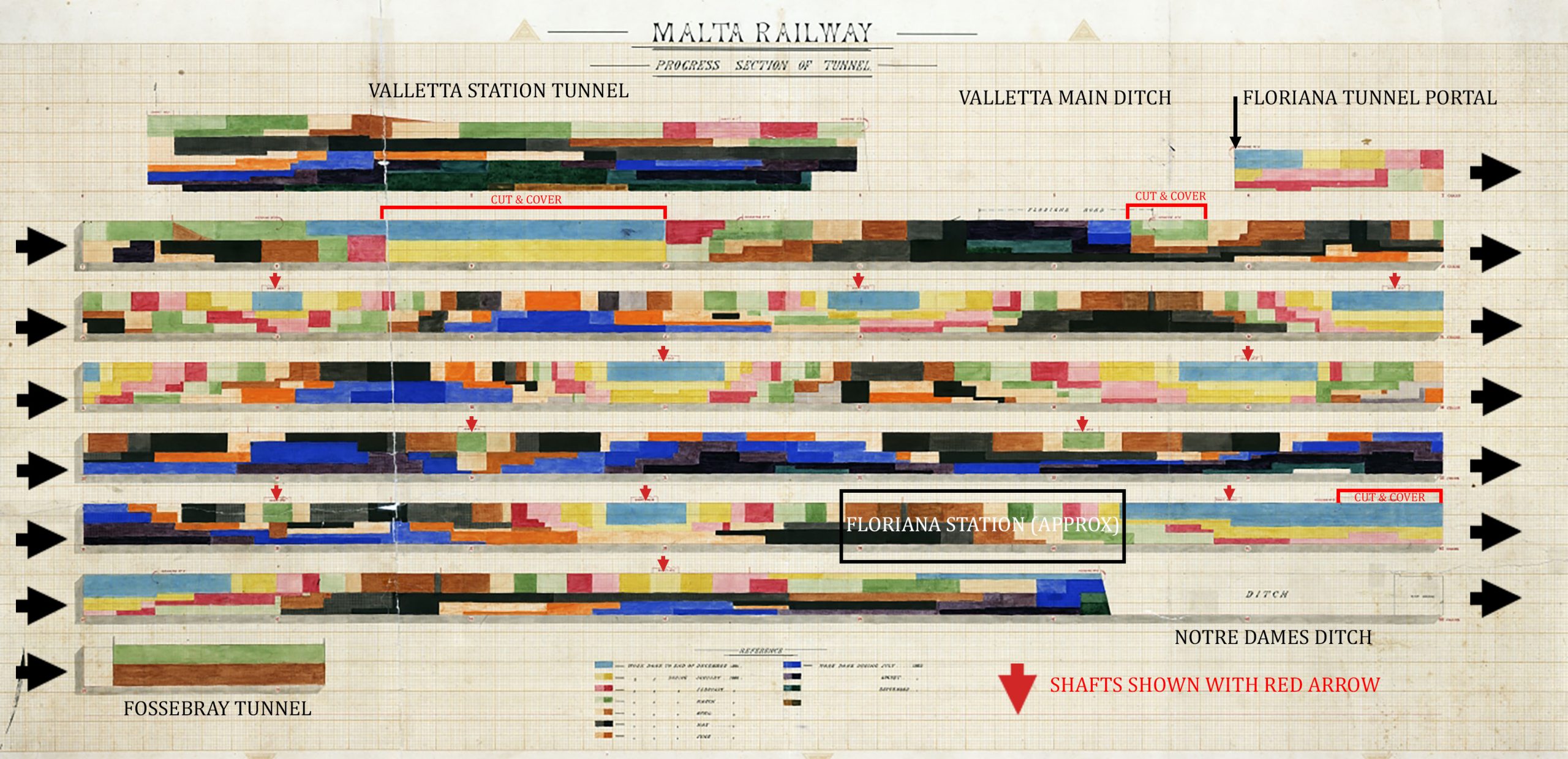 After a long series of delays tunnelling was amongst the first construction works on the railway, beginning at the end of December 1881. Rather than starting at the ends and working inwards, the plan was to sink eleven shafts and dig sections of the tunnel simultaneously. As well as this, there were two locations where the tunnel would be so close to the surface that a cut-and-cover approach was more economic. These were just beyond the main ditch where the road from Floriana crossed, and the gap between St James’s curtain and St Philip’s Bastion close to the location later used for Floriana station. The shafts would provide constant smoke ventilation to the tunnel, but the trench-dug sections of the line received a stone-built vault before being covered over.