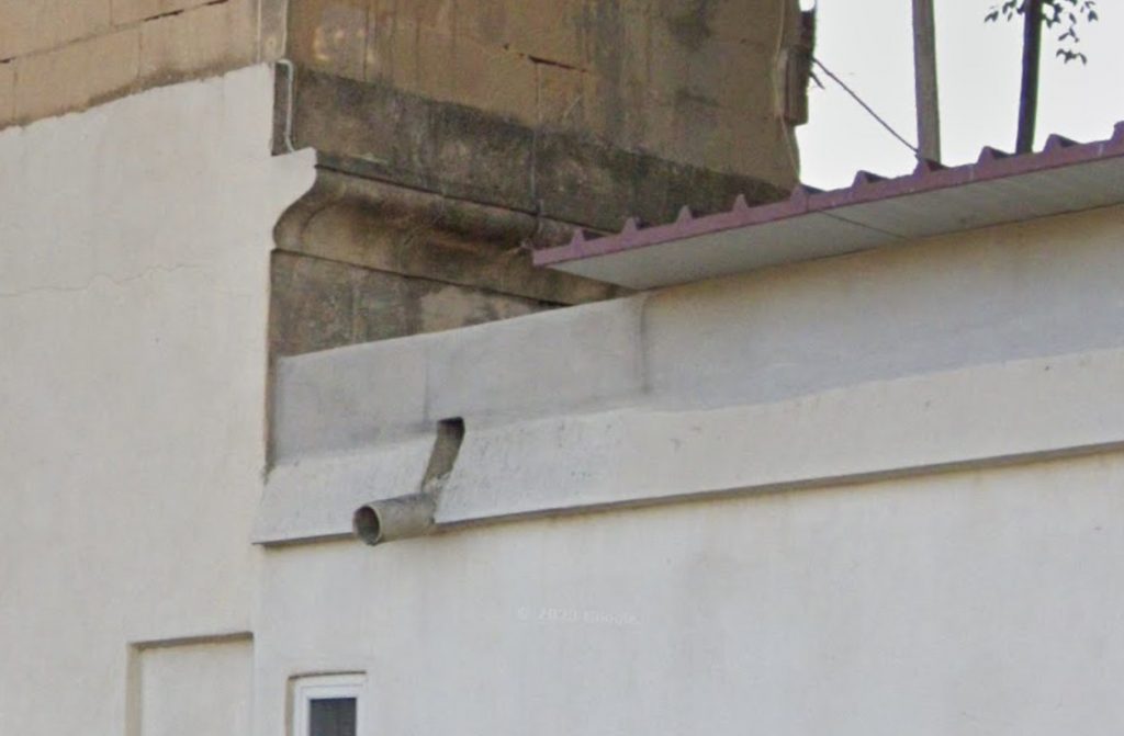 The railings still attach to a stone wall, one with those distinctive and odd pointy coping stones. The opening in the wall has been enlarged, it seems, to create a garage entrance. Although the latrine wall has been cut-back, the projecting cornice around the top looks to survive as part of the present house.