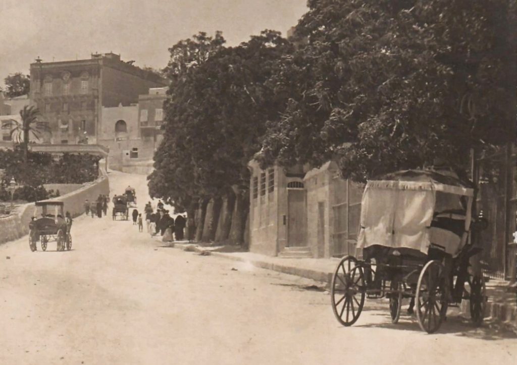 This is an undated but important view looking up Racecourse Road towards Saqqija Hill. A karozzin waits for fares while several others are already half way up the hill, overtaking a small crowd of people, probably passengers recently having disembarked from a train from Valletta.