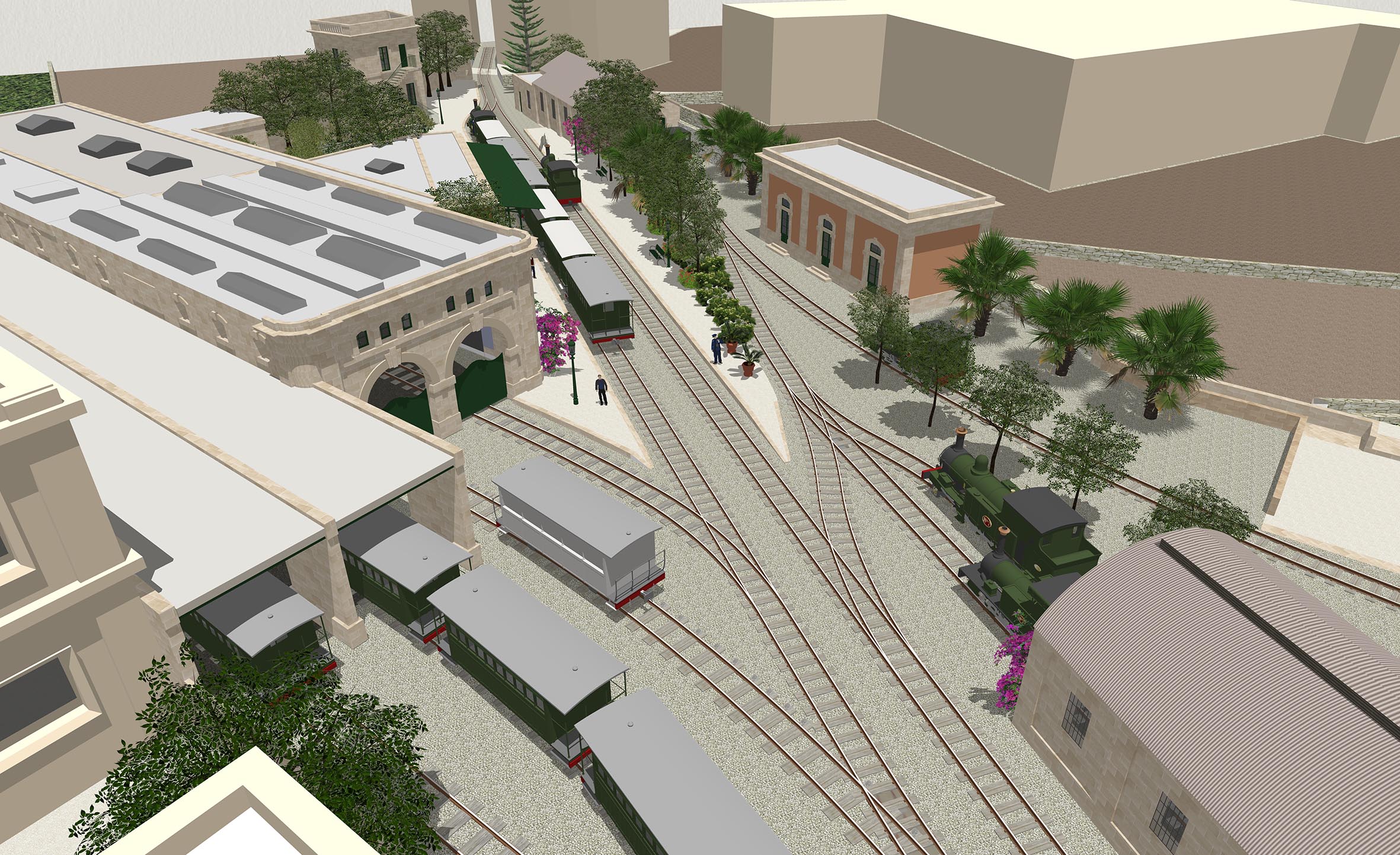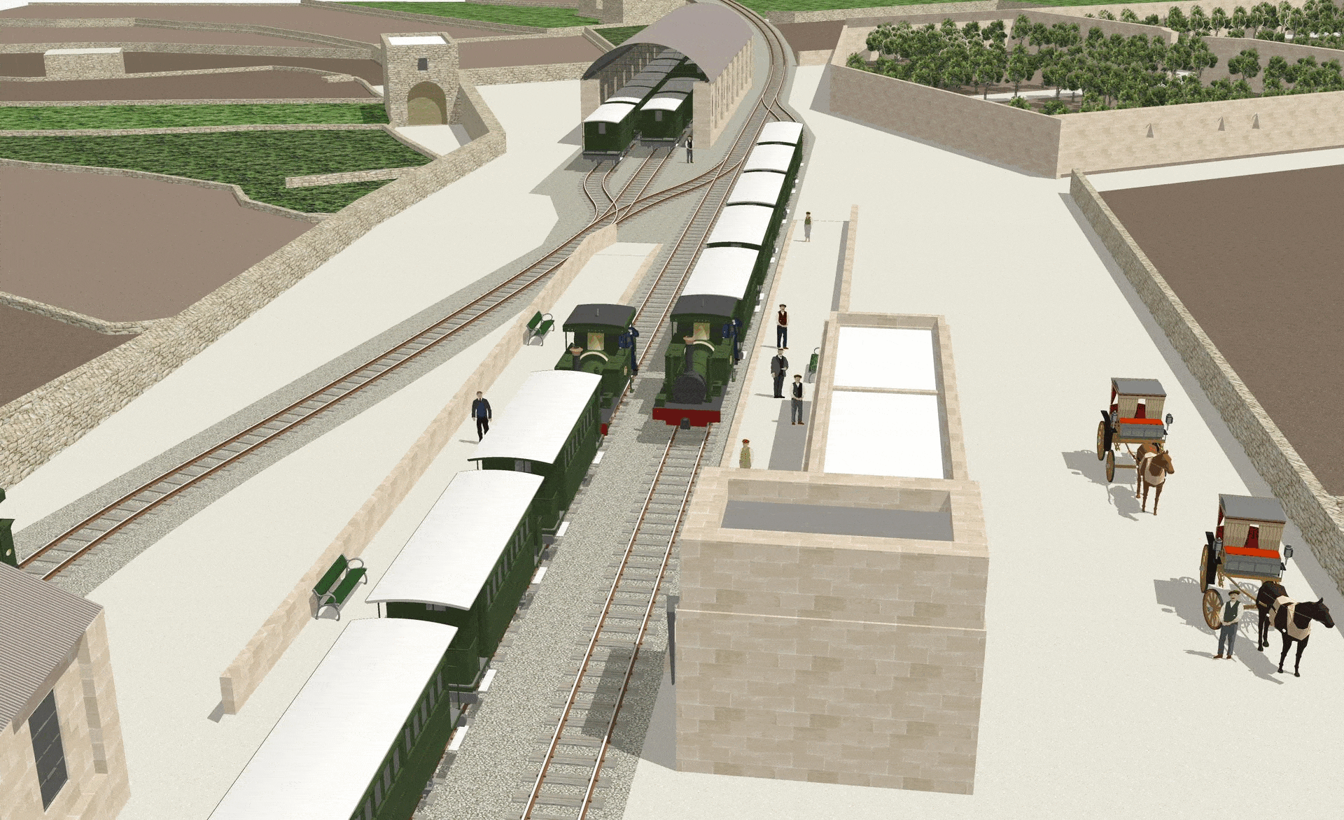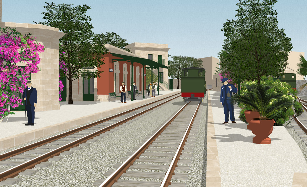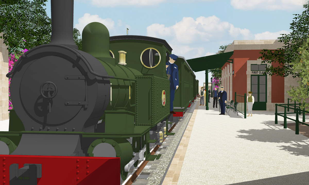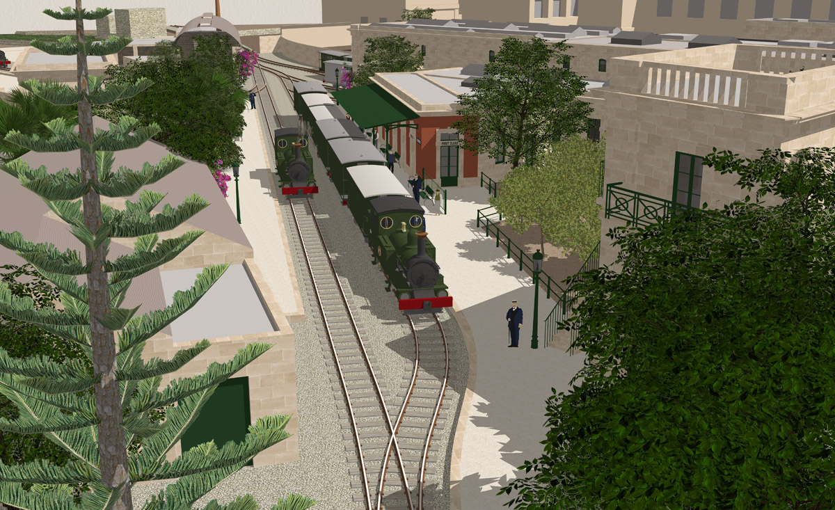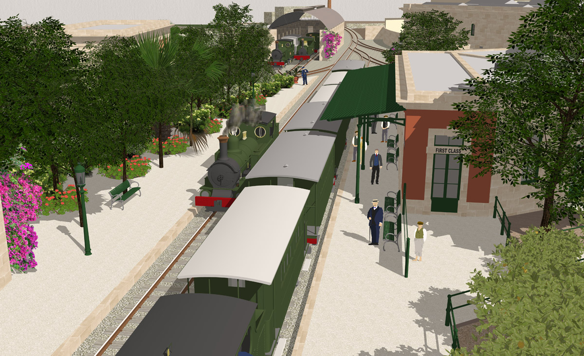 Hamrun was transformed during its lifetime, perhaps more than any other of the Malta Railway’s stations. Despite there being many photographs of the station in later years, there are few visual records beyond the few original drawings that show the station before it was entirely rebuilt at the start of the Twentieth Century. Two periods have been recreated here: the original basic station and buildings that replaced the gardens of Ta Blacas, and the site in its final form with its celebrated engineering works and gardens. Together, they show how Hamrun station developed over a thirty-year period,