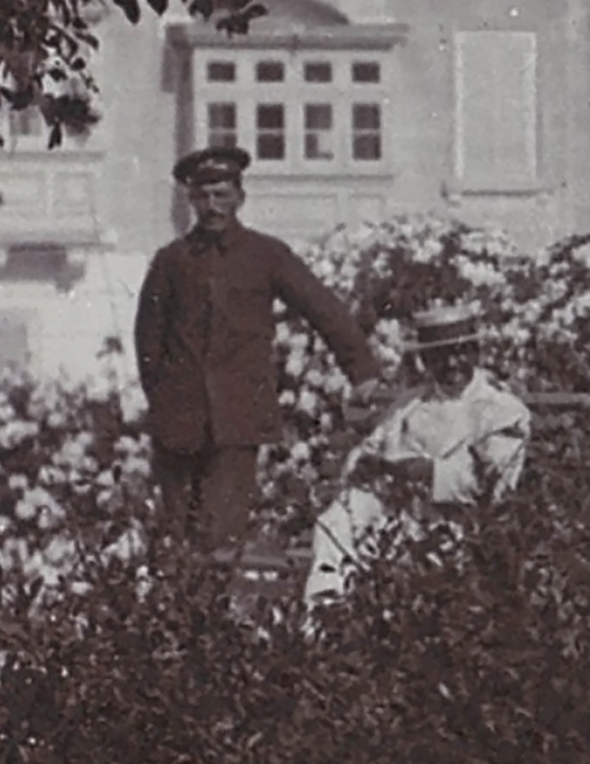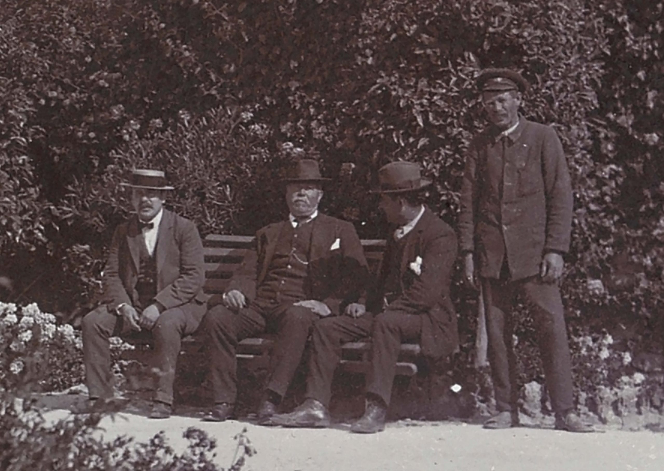 With this new clarity, it’s possible to see that two of the gentlemen captured are probably station staff. Both wear identical caps and uniforms with high buttoned collars. The staff are known to have been provided uniforms of blue serge.