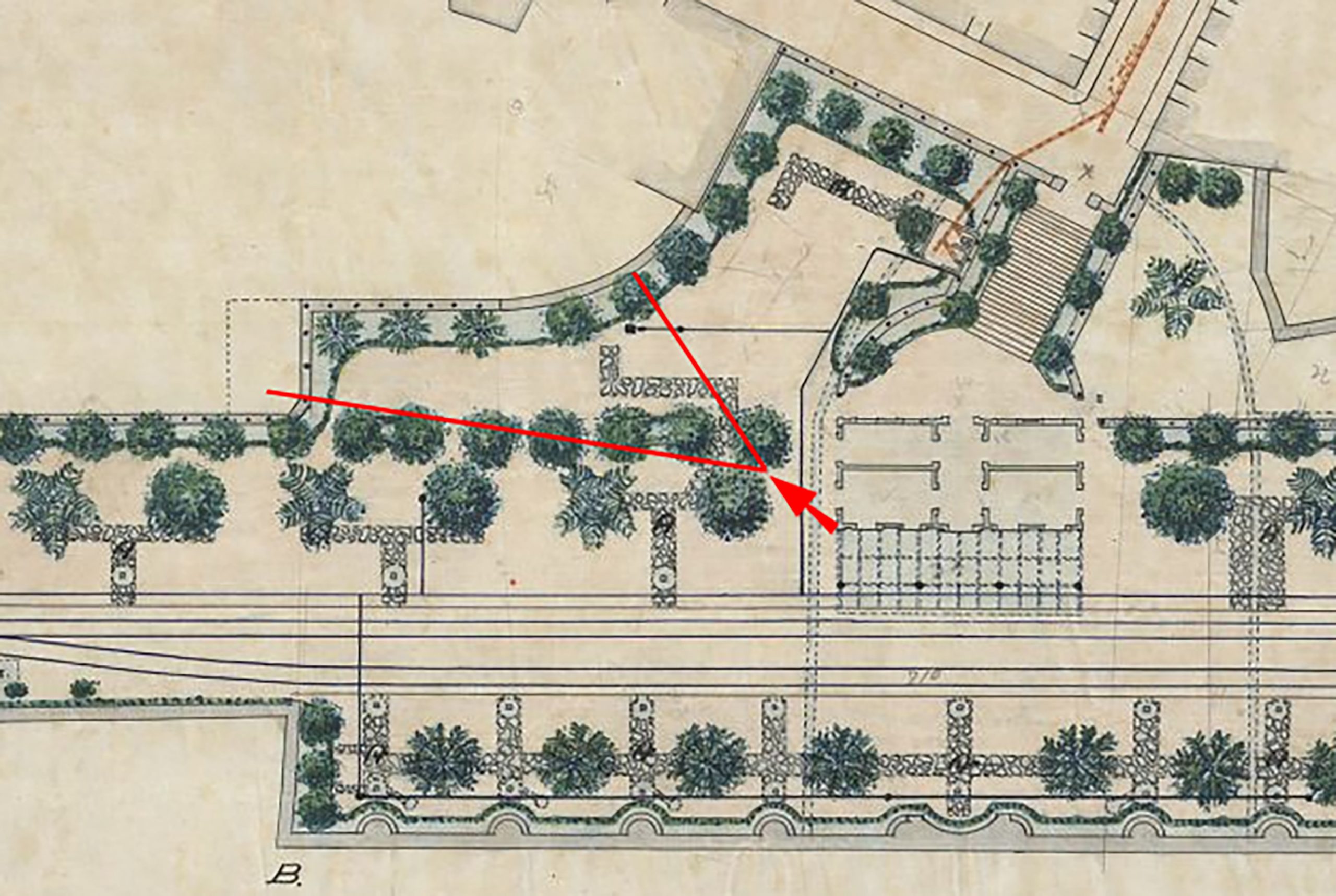 This is a view I’ve seen before, but only ever as a printed postcard. Here is a copy of an actual photographic version of the view towards the back of Birkirkara station platform through the famous public gardens. The date’s uncertain, but likely to be around 1915. The photographer is standing almost beside the station building, on its west side and looking towards the town beyond the station perimeter.